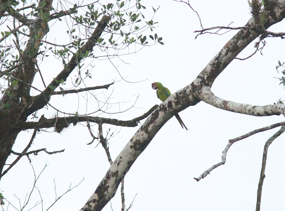 With the extra time in the evening we drove onto a side road where Steven knew that Great Green Macaws sometimes appeared before going to roost. We quickly saw Red-lored Parrots, Olive-throated Parakeets, and a Bat Falcon as mist turned to light rain. The macaw then started calling. I had hoped we might get to see one (it and quetzal were the two I most wanted to see of the birds I thought we had a chance at) and we drove a little further to get closer to the tree.